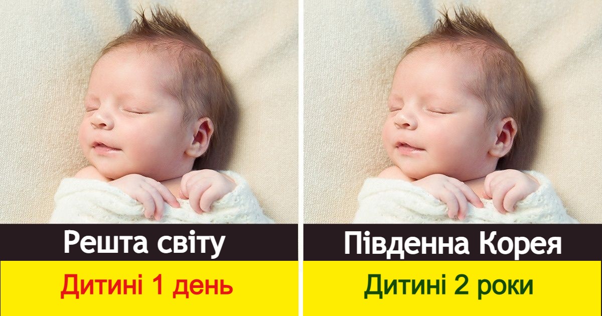 Якщо у нашій країні дитина народилася 31 грудня, то 1 січня їй виповниться 1 день. А от у Південній Кореї новонароджена дитина вже вважається однорічною, а наступний рік життя зараховується з настанням Нового року. Виходить, якщо дитина народилася 31 грудня, то 1 січня їй виповниться вже 2 роки. Проте це, в офіційних документах використовується міжнародна система визначення віку.