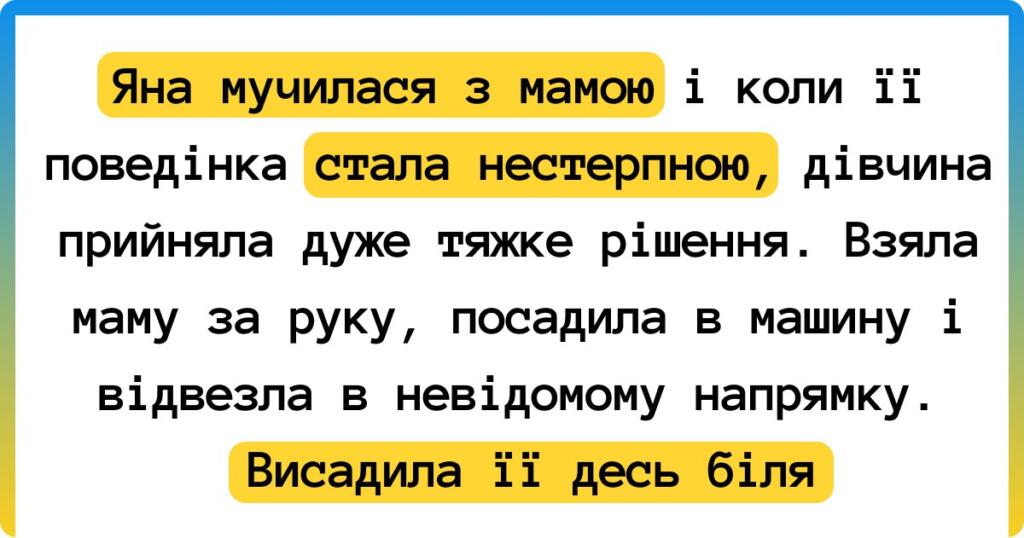 Яна мучилася з мамою і коли її поведінка стала нестерпною, дівчина прийняла дуже тяжке рішення. Взяла маму за руку, посадила в машину і відвезла в невідомому напрямку. Висадила її десь біля лісу і в сльозах поїхала додому. Іншого рішення вона не змогла знайти.