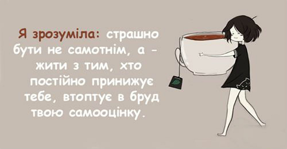 Особисто я впевнено можу сказати, що не боюсь самотності. Людині має бути насамперед комфортно наодинці з собою. Я боюсь бути з тим, хто зневажає мене. І ось, чому: