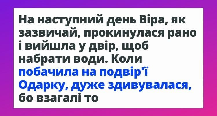 Пані Одарці вже було за 70 років, ледь на ногах стояла, а за господарством треба якось доглядати. До неї інколи приходила сусідка Віра. Юна дівчина жила неподалік з маленькими братиками. Вони всі тіснилися у невеликій хаті, мама важко працювала на двох роботах, батька давно не стало.