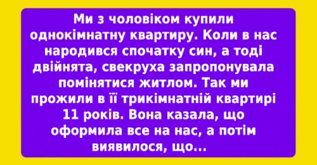 Тепер я навіть не знаю, що нам робити. У мене сім’я із шістьох осіб. Нам знову повертатися в однокімнатну квартиру? Там навіть дихати не буде змоги, не те щоб жити вшістьох. Я вже навіть встигла забути, як це тіснитися в кількох квадратних метрах. Не розумію, чому свекруха нам збрехала? Невже вона не могла попередити одразу? Ми б тоді щось придумали із житлом. Натомість ми стільки грошей потратили на неї. А в результаті що? Залишилися з нічим.