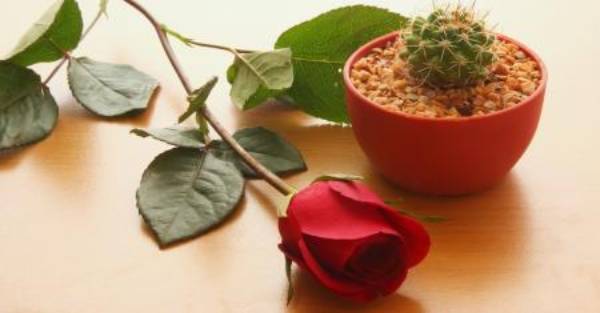 Кактус залишається однаковим завжди, символізуючи вірність та смиренність.Троянда ж дуже примхлива квітка. За нею потрібно доглядати. А часом навіть створювати комфортні умови. Сама ж про себе вона не подбає.