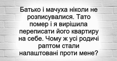 Валентині таке не сподобалося. Спочатку вона не вірила, а потім я попросила її звільнити квартиру. Вона довго опиралася, погрожувала, що до суду подасть. Втім, ми обидві знали, що справу вона програє. Батько з нею навіть не розписувався, тому жодних прав на майно вона не мала.