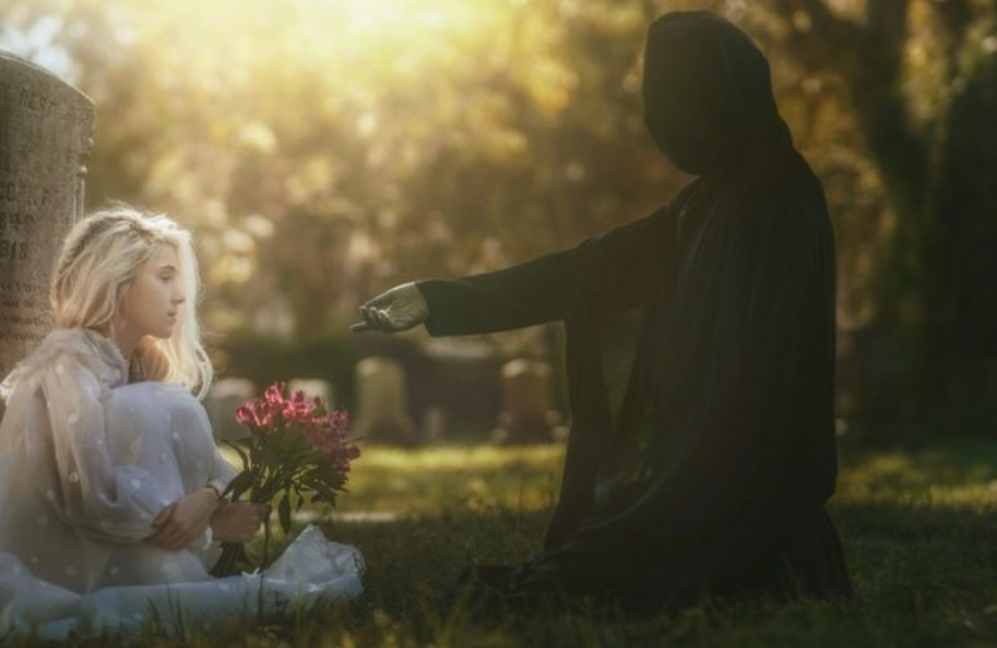 Чоловік підійшов до дитини і нахилився. Він простягнув руку, і замість пальців у нього виявилися голі кістки. Малятко підняла голову, але розгледіти обличчя незнайомця не змогла – воно ховалося в темряві під капюшоном.