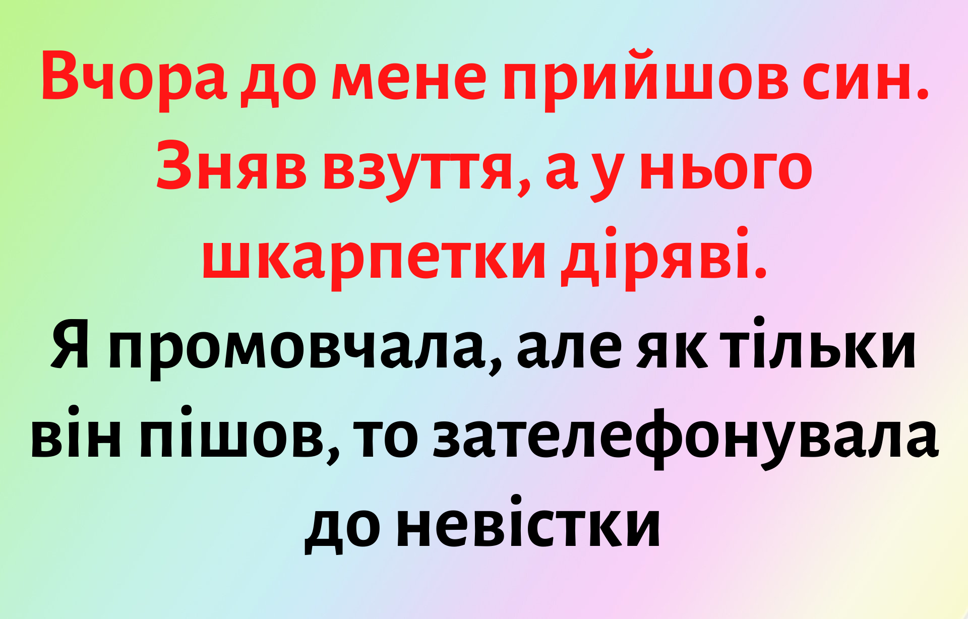 – У нього є своя квартира велика, машина і робота. Ну але довго не було дівчини. А потім приходить у гості з якоюсь білявкою та каже, що це його наречена. Йому тоді було 30 років. Я зраділа, але не через те, що дівчина була дійсно красивою. Нарешті він зрозумів, що у такому віці треба весілля робити! Хоча я сподівалася, що він ще у 20 років приведе у дім невістку. Катя мені одразу не сподобалася. Досі не можу з нею знайти спільну мову. Добре, що з онукою дозволяє мені бачитися! – бідкається пані Мирослава своїй сусідці.