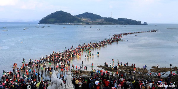 У такого чуда є наукове пояснення: дорогу між островами утворює різниця припливів і відливів та місячні цикли цих процесів. У цей період Південну Корею просто кишить туристами, які хочуть на власні очі побачити це неймовірне явище природи.