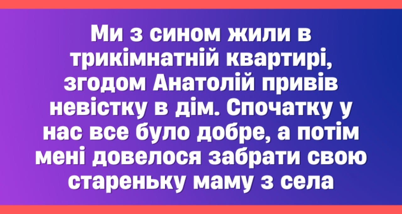Я одразу знайшла спільну мову з невісткою. Ми добре ладнали, поділили домашні обов’язки. Здається, що у нас все було добре. Дівчина мила, привітна, хазяйновита. Все-таки моєму синові дуже пощастило. Однак, минулого місяця захворіла моя старенька матуся. Вона жила сама у селі, до якого їхати треба мінімум годину. Я не могла часто до неї приїжджати та розриватися між селом та роботою. Тому зібрала всі її речі та привезла до себе у місто. Тут і лікарня неподалік, бабуся має свою кімнату. Мені навіть на душі спокійніше стало, що вона буде поруч.