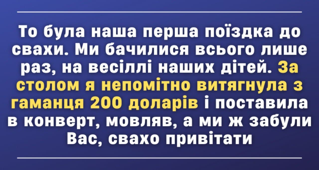 Мені чомусь так стало соромно перед свахою, адже я була про неї поганої думки. Але ж у неї таке велике та добре серце, зуміла виховати чудову донечку. Дістала з сумки конверт, поставила туди 200 доларів.