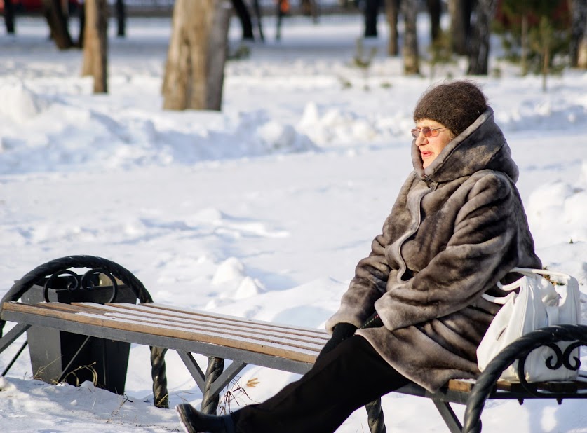 Сніг падав на волосся дівчини. Вже запалали ліхтарі. Раптом на лавочку сіла старенька бабуся та почала кидати птахам крихти хліба.