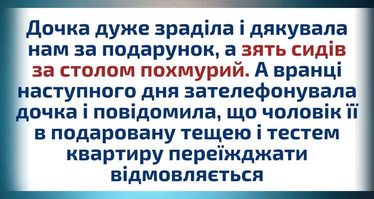 – Мамо, дякую, що купила з татом нам квартиру. Але, на жаль, ми не можемо прийняти такий подарунок від вас. Олег проти того, щоб ми переїжджали. Він боїться, що ви будете до нас часто приходити та поводитися так, немов ми вам винні. Але й дійсно так є. Бо ця квартира – задоволення дороге, нам й в орендованій добре жити.