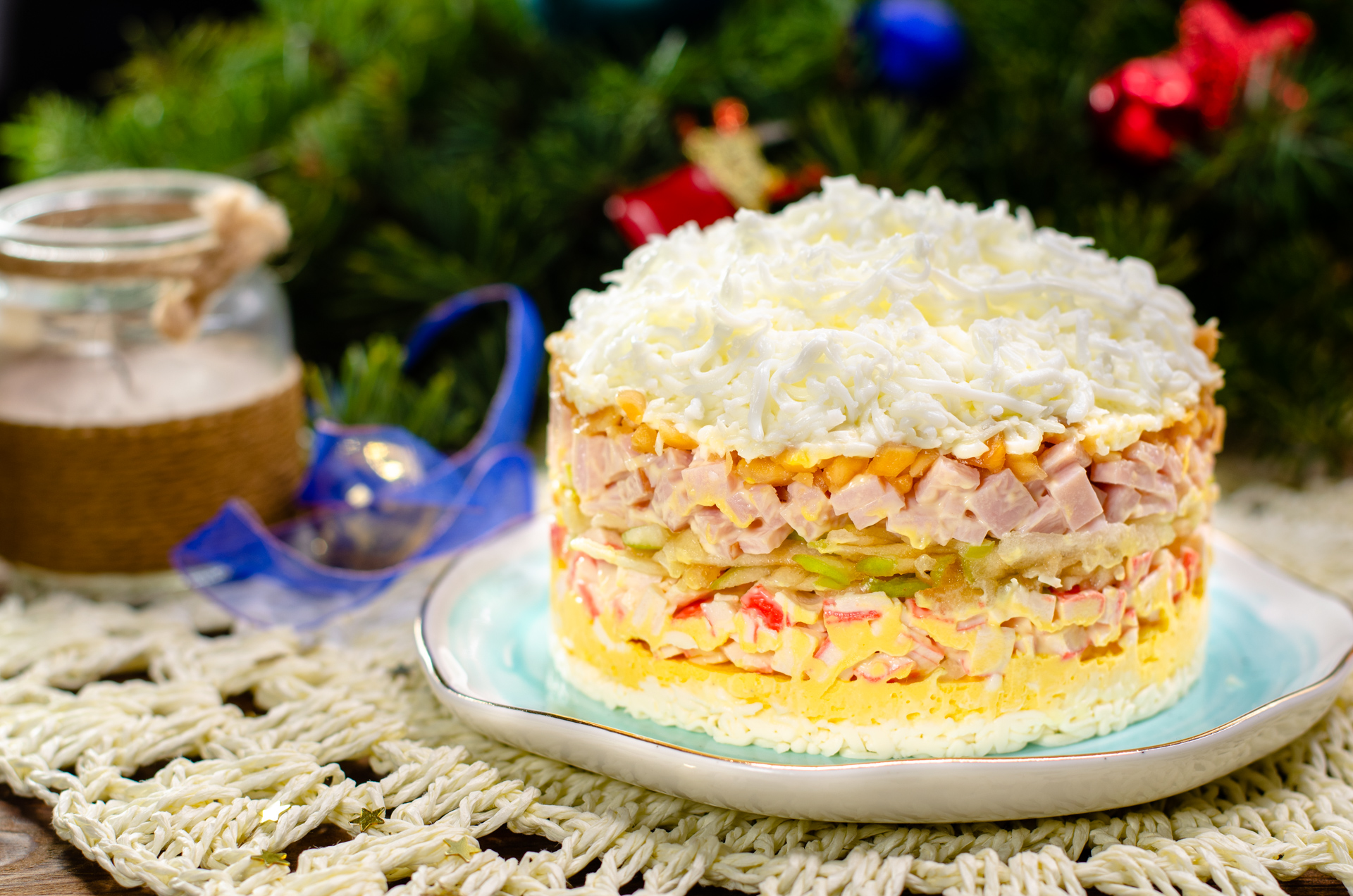 Ці зимові свята стануть найсмачнішими у вашому житті – разом із неабияк ніжним та соковим багатошаровим салатом із крабовими паличками і шинкою.