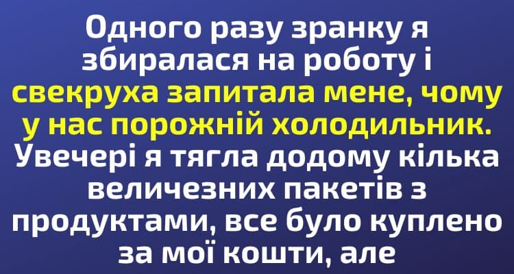 Вирішила не сперечатися зі свекрухою, щоб не зіпсувати собі настрій. Ще й на роботу запізнювалася. Тому ввечері я самотужки тягла додому три великі пакети з продуктами. Розкладаю все у холодильник, а пані Надія тут як тут: