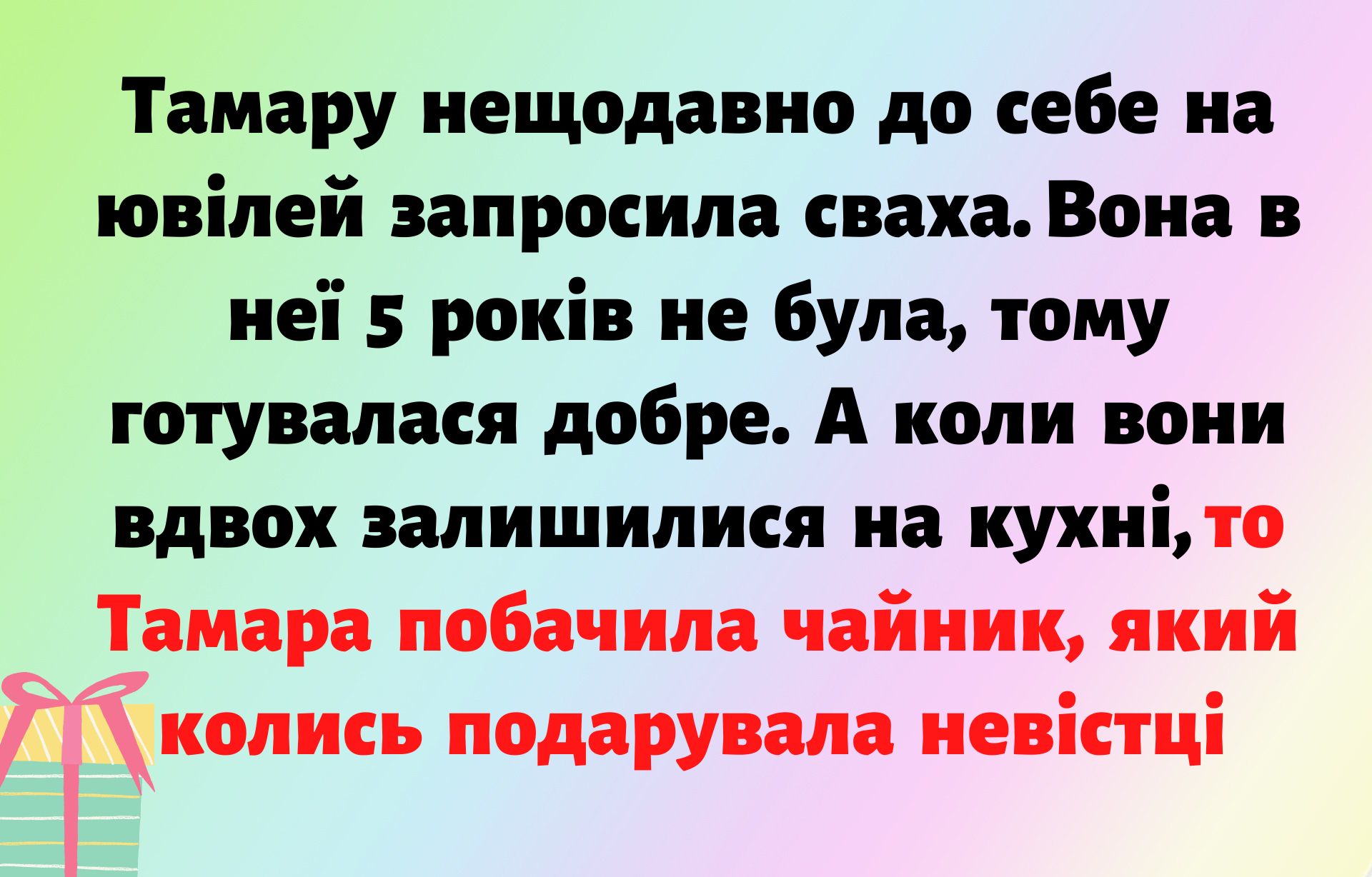 – Ой, та це моя Галинка принесла. Сказала, що їй вдома така річ не потрібна. І щоб пилюкою не припадала та була корисна у господарстві, то мені віддала. А чайник такий хороший, – радісно відповіла сваха. Звісною що вона не здогадувалася, хто саме купив цей чайник.