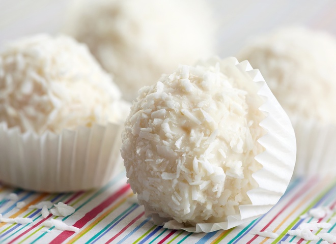 4. Розсипте решту кокосової стружки на рівну поверхню та обваляйте в ній цукерки.