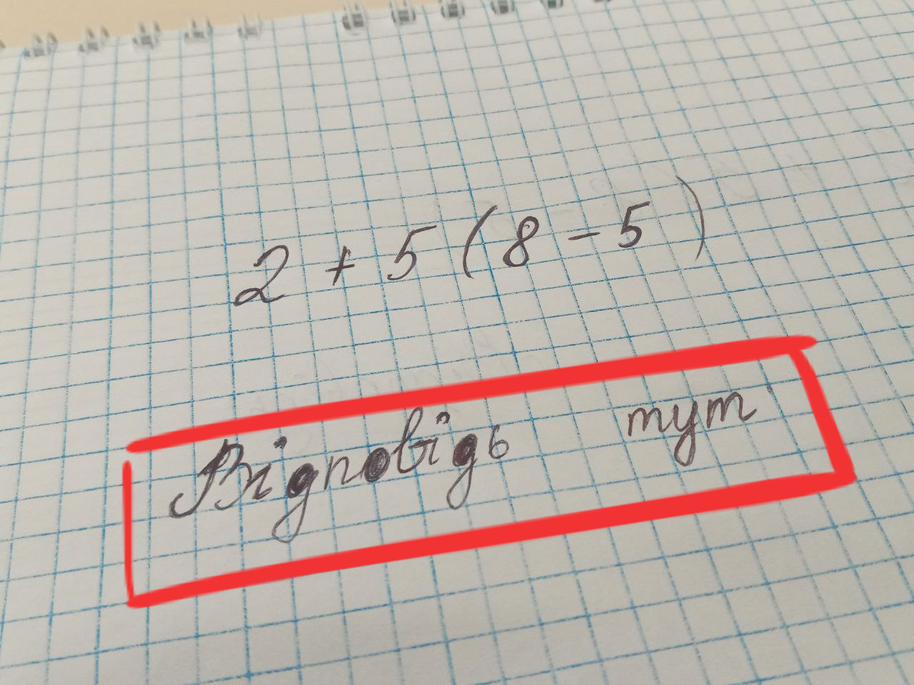 Рішення криється в простому правилі порядку дій: спочатку проводяться дії в дужках, потім пріоритет дістається множенню і діленню, а в кінці — додавання і віднімання. Якщо дотримуватися правил, то приклад дуже простий: спочатку віднімання в дужках, потім множення, і після останньої дії, додавання, отримуємо правильну відповідь — 17.