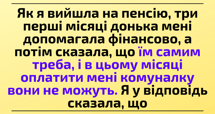 – Мамо, мені зарплату затримують на роботі. А треба за іпотеку заплатити, та й син не має нового одягу. Про свої потреби я вже мовчу. Вибач, але ми не можемо цього місяця тобі заплатити за комуналку. Будь ласка, ти свої гроші з пенсії витрати, а я тобі все поверну, обіцяю!