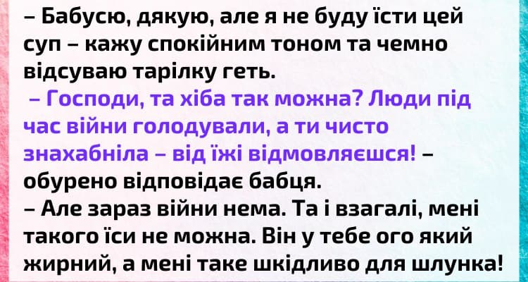 – Господи, та хіба так можна? Люди під час війни та голодували, а ти чисто знахабніла – від їжі відмовляєшся! – обурено відповідає бабця.