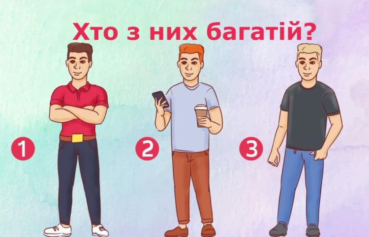 1. Багачем видається хлопець посередині. Наче все сходиться: дорогий телефон, кава, стриманий одяг. Але ж у заможних людей рідко знаходиться час на те, щоб посидіти у смартфоні. Тоді що виходить? Перший? Виглядає впевнений. Та ні, багата людина хизуватися подібним не стане. ТО й виходить, що найбагатшим є третій молодик. Погоджуєтеся?