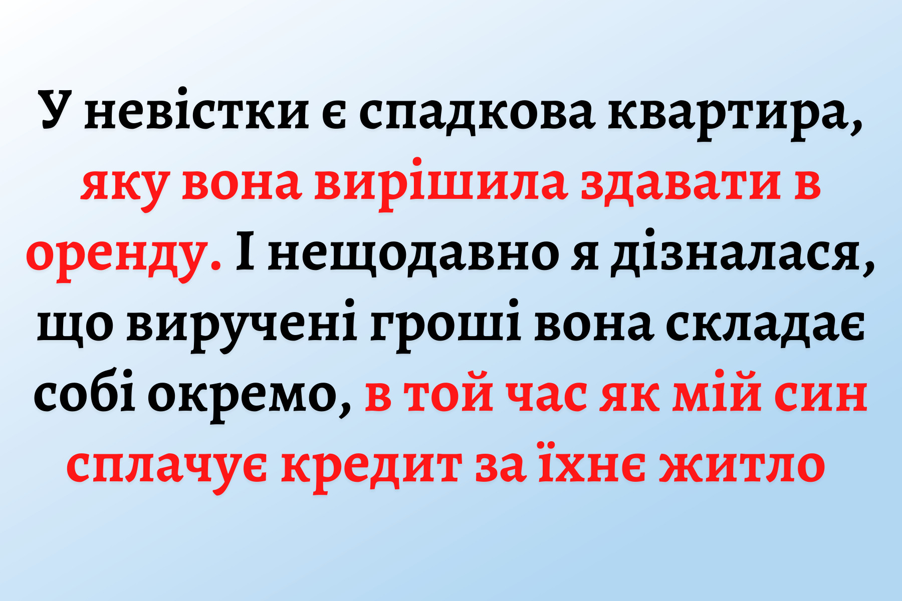 У невістки була квартира, я знала це точно. Та вона не спішила туди в’їжджати. Поселила квартирантів. Вони жили там перших пів року після весілля, поки збирали документи на іпотеку. Але Оксана одразу умову поставила: пів року в мене, а далі у своїй квартирі. Так швидко усе не вийшло. З квартирою проблеми були. Тож син і попросив пожити у мене. Я погодилась, думала ненадовго.