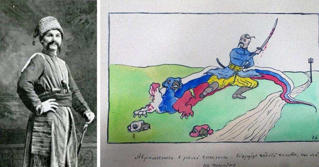 Автор вирішив залишити лаконічний підпис до свого шедевру: “Авраменко в ролі Гонти відрубує голови гадові, що лізе на Україну”.