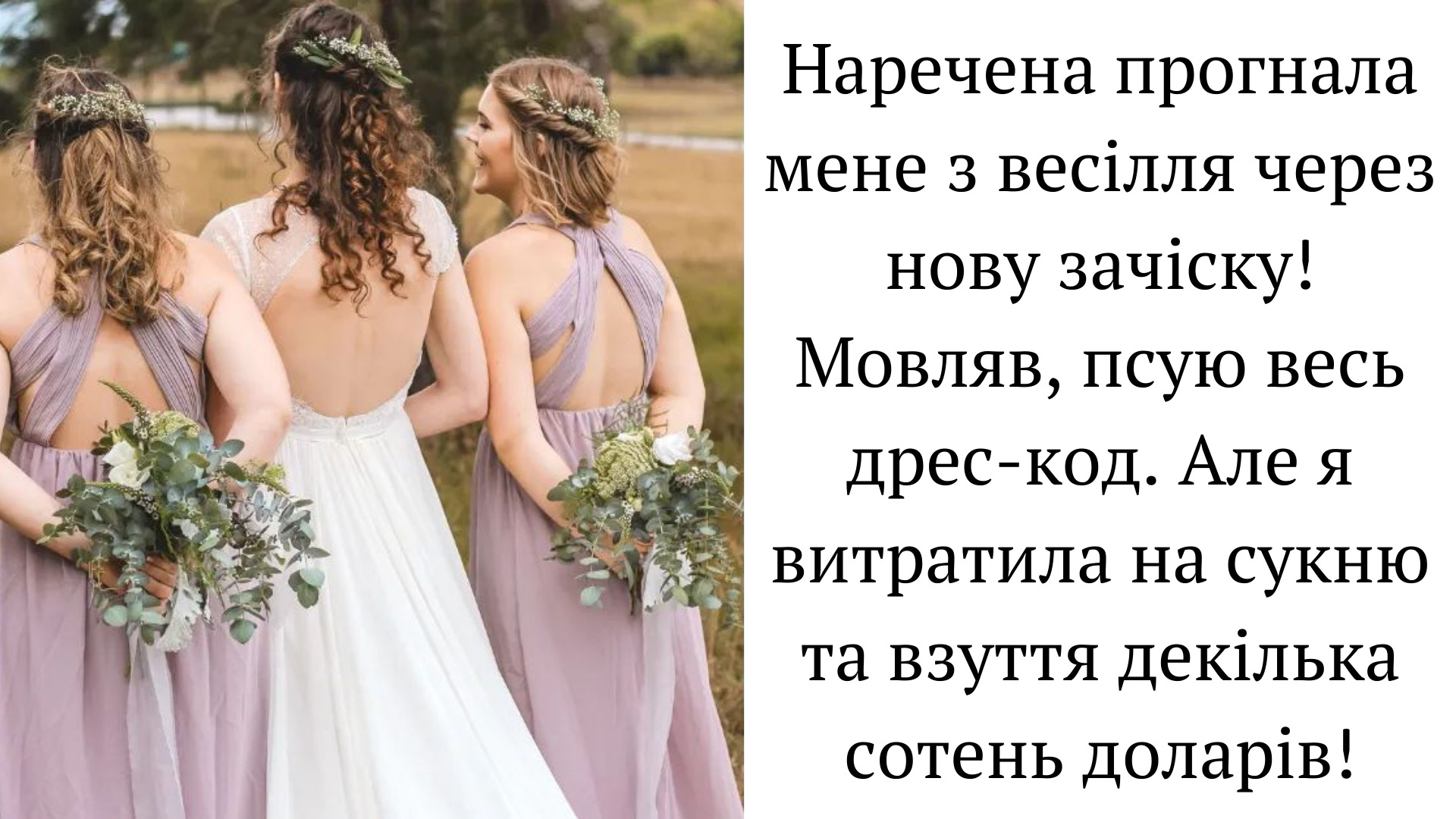 “Це трапилося за два тижні до весілля. Ми якраз обговорювали наші сукні та зачіски, адже я була дружкою. Звісно, що у кожної з дівчат різна фігура, тому ми домовилися не одягати однакові плаття. Згодом, я підійшла до подруги та сказала, що хочу записатися у салон краси та змінити зачіску. Вона не була проти. Однак, згодом наречена почала мені докоряти, мовляв, зачіска не личить до образу дружки та псує весь вигляд. А ще додала, що інші дружки також не в захваті від моїх змін!”