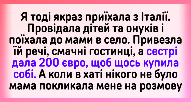 Привезла мамі одяг, племінникам дала цукерки та іграшки, Христині поклала до кишені 200 євро. Тоді всі вийшли на двір й мама покликала мене до розмови на кухню: