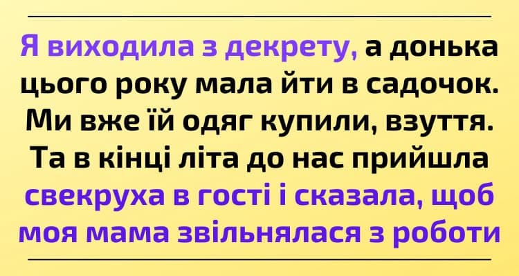– Ну якщо ти така вперта, то нехай твоя мати звільниться з роботи та буде за онукою доглядати. Все-таки не чужа людина, а рідна бабуся! Ось я допомагала своїй доньці з малюком!