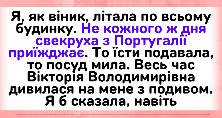 Тоді я з самого ранку була на ногах – у гості приїжджає свекруха з Португалії. Наготувала стільки смачних страв, помила підлогу до блиску. А Вікторія Володимирівна дивилася на мене та квартиру таким поглядом, ніби неприємно дивувалася. Як то кажуть “очікування та реальність” Однак, довго мовчала. Я відвела дітей до школи. Тільки-но переступила поріг будинку, як старенька крикнула: