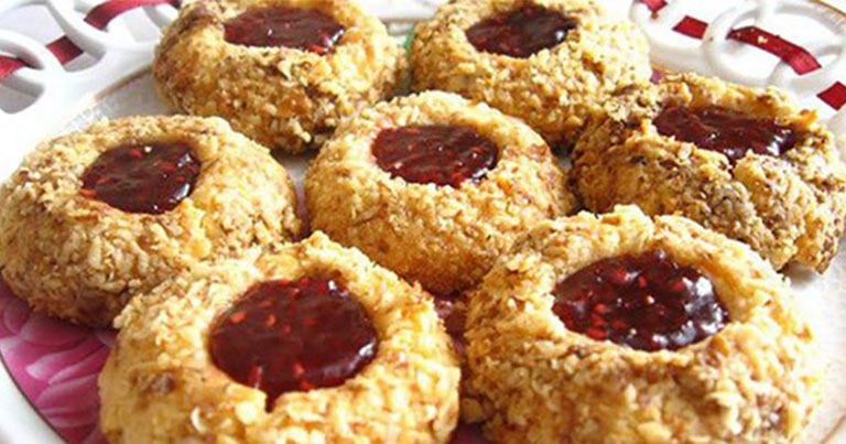 - Посипаємо його горіхами, а у ямки викладаємо варення.