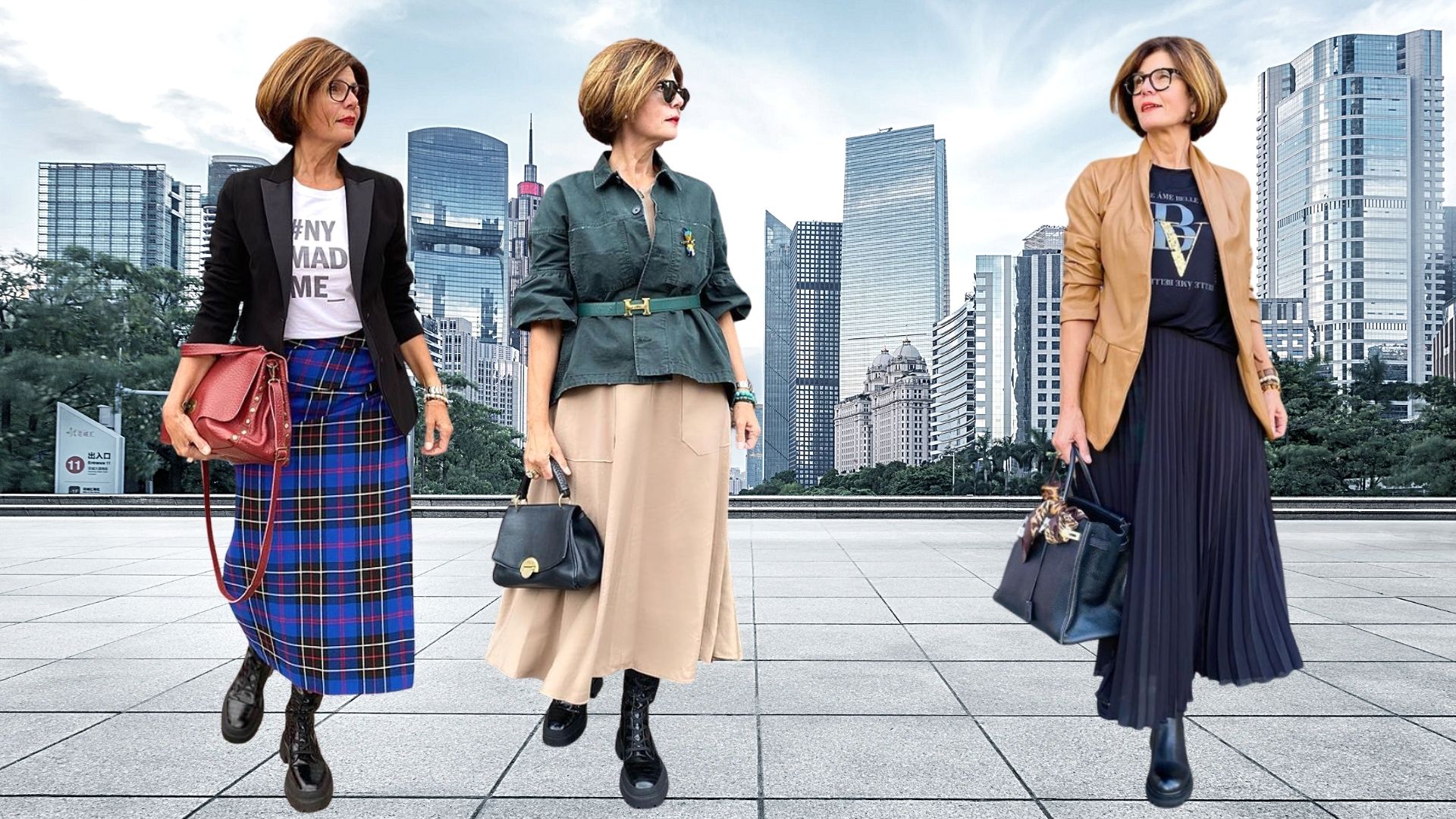 10. Чорна плісирована спідниця може виглядати стильно у різноманітних комбінаціях. Одним із цікавих варіантів є поєднання з сорочою у дрібний принт та бомбером кольору хакі. Яскравим акцентом стане червона сумка, а завершить образ чорне взуття.