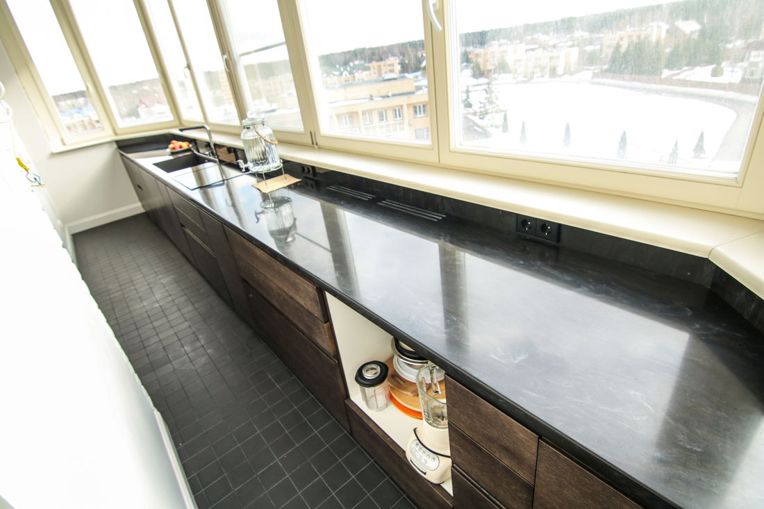 Єдиними мінусами такого рішення є недешевий ремонт і наявність купи дозволів. Але, якщо ви все ж налаштувалися на такий крок, то в результаті отримаєте компактну та естетичну кухню з красивим краєвидом.